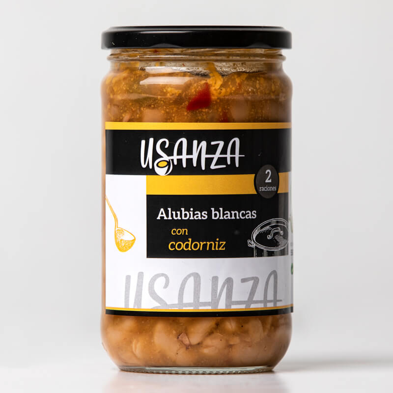 Alubias blancas, codorniz (1/2 ud.), cebolla, pimiento, zanahoria, tomate, puerro, aceite de oliva y sal.